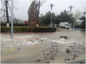 不到10分鐘,應(yīng)急搶修隊員迅速到達(dá)南湖廣場?,F(xiàn)場發(fā)現(xiàn)有大量泥沙被水沖出,這說明漏水點附近地基可能已被水流淘空。為防止發(fā)生人員安全事故,搶修人員冒著大雨站在現(xiàn)場,提醒過往車輛和行人繞行。經(jīng)現(xiàn)場仔細(xì)勘查,搶修人員迅速制定維修方案,并投入到緊張的搶修工作。