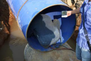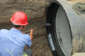一截管道安裝完畢,王俊鉆進了管道中,沿著新鋪設(shè)的這截6米長的管道,一邊爬一邊觀察,檢查管道接口處的皮圈是否有縫隙,有沒有受擠壓而外露。見皮圈處平整無縫,王俊才放心地爬了出來。盡管當天氣溫不高,但管道中密不透風,讓人喘不過氣,一趟爬下來,王俊的腦門上布了一層細細的汗珠。