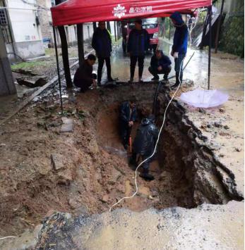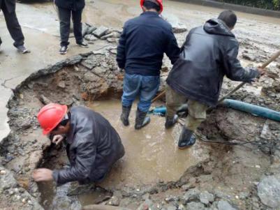 因爆管事件突發(fā),搶修人員趕到現場時,水泥路面已塌陷出一個大坑,馬路上到處是積水,天空還下著雨。為了盡快修好爆裂管道,在最短時間恢復供水,搶修人員不懼艱辛,不顧泥水和雨水的困擾,齊心協(xié)力、緊張有序地進行著漏點的搶修。經過近4個小時的奮力搶修,終于完成了瑪麗醫(yī)院DN400PE管修復工作,保障了群眾正常用水。