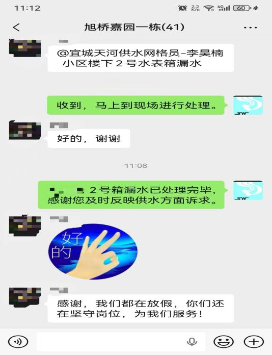 “感謝,我們都在放假,你們還堅守崗位,為我們服務!”10月5日11時08分,宜城市旭橋嘉園小區(qū)業(yè)主李女士在小區(qū)業(yè)主群里,向襄陽水務集團宜城天河供水有限公司網格員李昊楠發(fā)來感謝消息。而就在23分鐘前,她剛反映家中停水問題,現(xiàn)在水管故障已徹底解決,如此高效的服務響應讓業(yè)主倍感貼心。